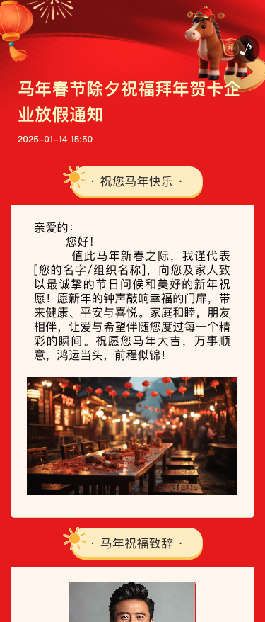 首页 / 模板商店 / 中国风红金春节祝福拜年贺卡企业祝福放假通知