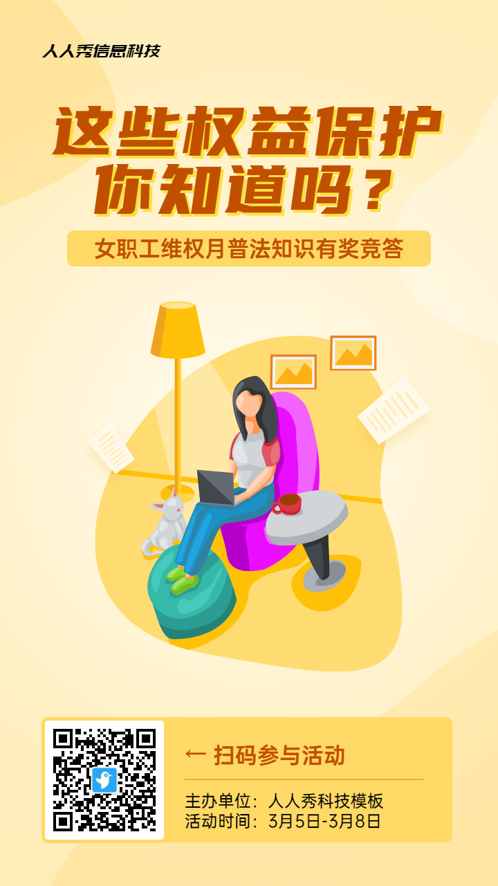 首页 / 模板商店 / 黄色扁平风格政府组织妇女节女职工权益保护知识答题活动海报