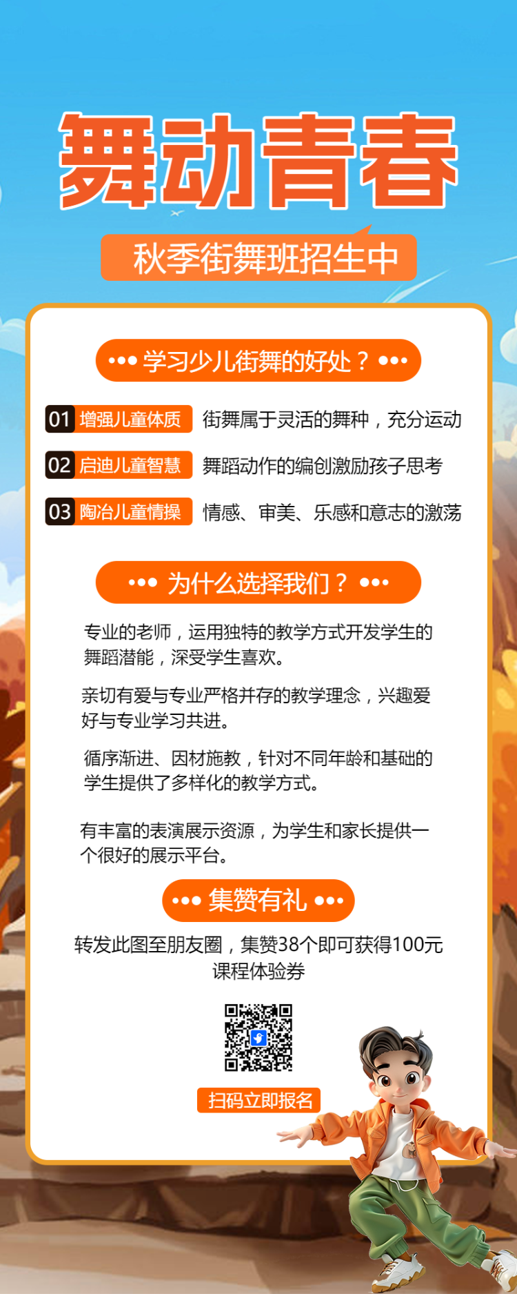 首页 / 模板商店 / 教育培训秋季少儿街舞班招生促销